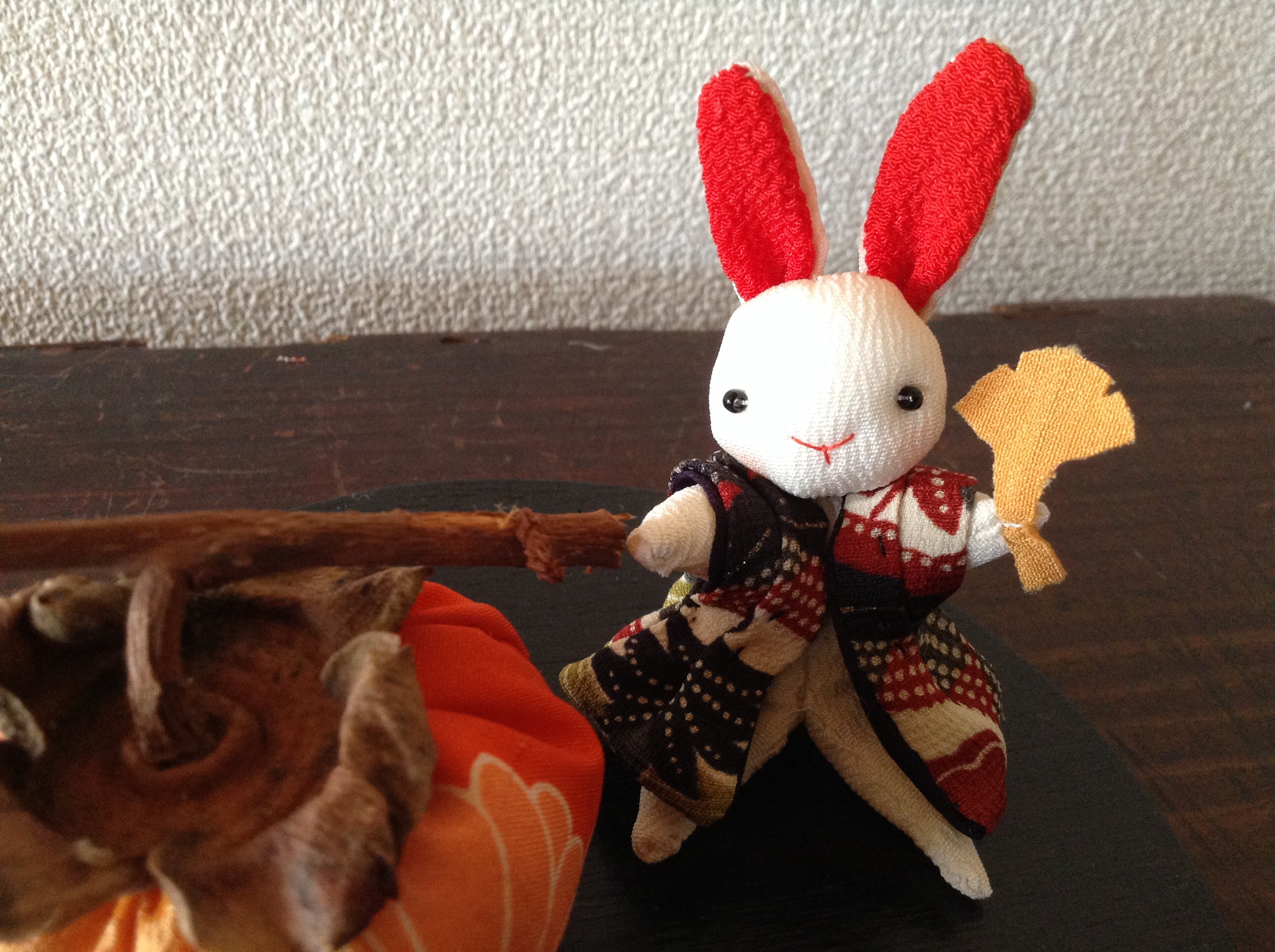 定番うさぎちゃんには 小さな銀杏のはをもたせています