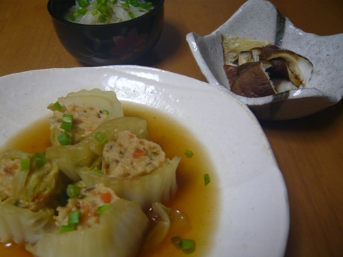 本日の献立 白菜のカラフル肉巻き & 椎茸焼き & もやしの味噌汁