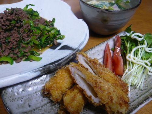 本日の献立 ちくわのフライ & 高菜と肉炒め & 小松菜とベーコンスープ