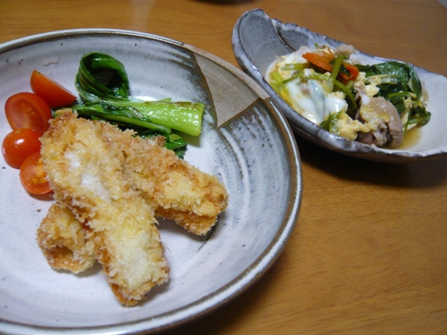 本日の献立  ちくわのプフライ & 豚肉の煮びたし