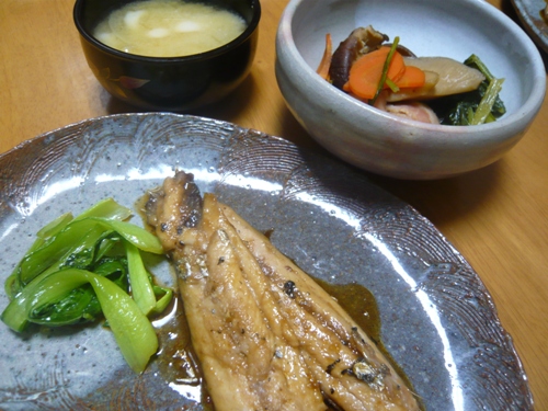 本日の献立 海老チリ & 大根と豚肉の甘煮 & しらす玉子焼き & 青梗菜味噌汁
