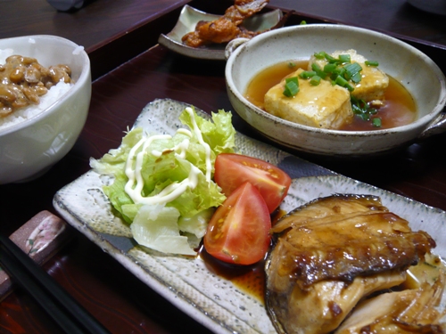 本日の献立 さわらの照り焼き & 揚げ出し豆腐 & 納豆ご飯