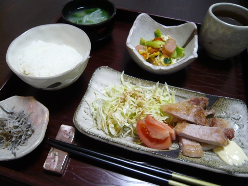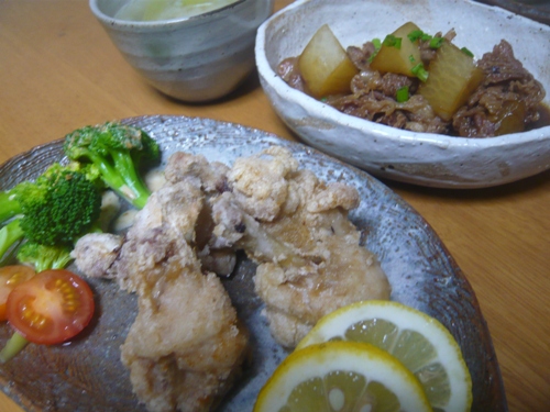 本日の献立 鶏の唐揚げ & 大根と豚肉煮 & 小松菜味噌汁