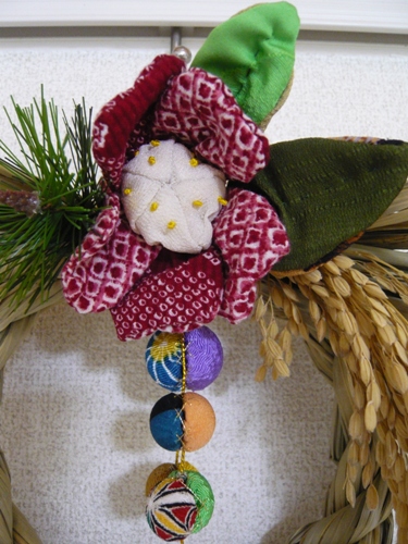 市販のしめ縄に 古布で作った椿を飾りました。