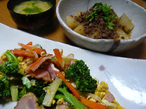 ブロッコリーのベーコン炒め & 大根の甘辛煮 & 白菜味噌汁